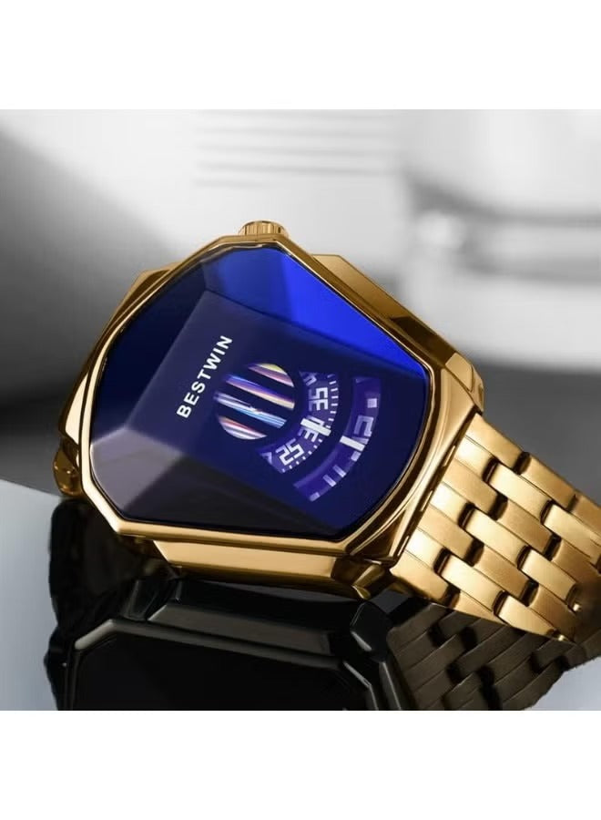 This watch showcases a futuristic digital wristwatch with a metal link band and a geometric, angular face design. The display is sleek with blue highlights, giving it a modern, tech-inspired aesthetic.